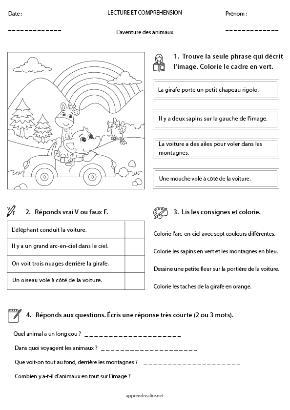 En voiture pour l'aventure ! Dans cette fiche, tu vas accompagner une girafe et un éléphant dans un voyage coloré. L'objectif est de bien comprendre ce que tu lis pour savoir quelles couleurs utiliser et pour répondre aux questions. Ouvre l'œil : entre l'arc-en-ciel et les montagnes, il y a beaucoup de choses à observer !