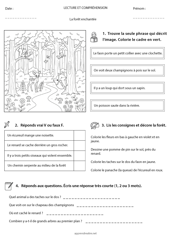 Voici une nouvelle fiche d'activités pour la collection Lecture et compréhension, basée sur l'image de la forêt. Il faut ouvrir l'œil et bien lire les indices pour retrouver le faon, l'écureuil et le renard coquin.